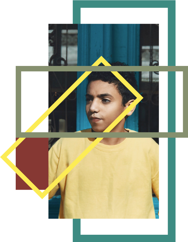 Young Arab boy in a yellow sweater facing sideways outside a bright blue door with his hands on his hips. He looks ready. The photo is overlaid with rectangles that look like viewfinders, putting the focus on him.